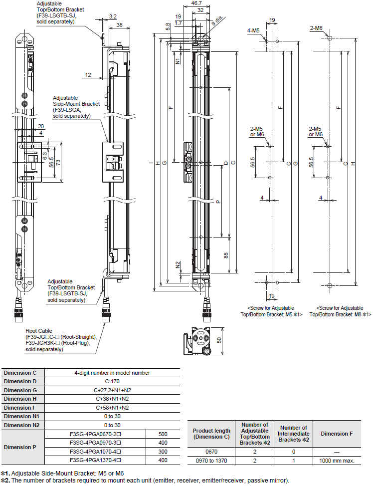 Mounted with Adjustable Top/Bottom Brackets (F3SJ, F3SN Adapter) (F39-LSGTB-SJ) and Adjustable Side-Mount Brackets (Intermediate Brackets) (F39-LSGA)